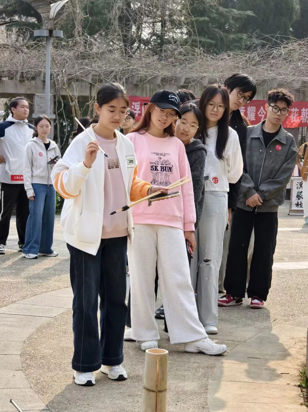 接下来是投壶,每个同学都大展身手,不仅考验手眼协调能力,还同时体验古时古人的休闲雅趣,沉浸式解锁传统游戏的快乐,每个参与者都得到了身心的双重享受与满足。